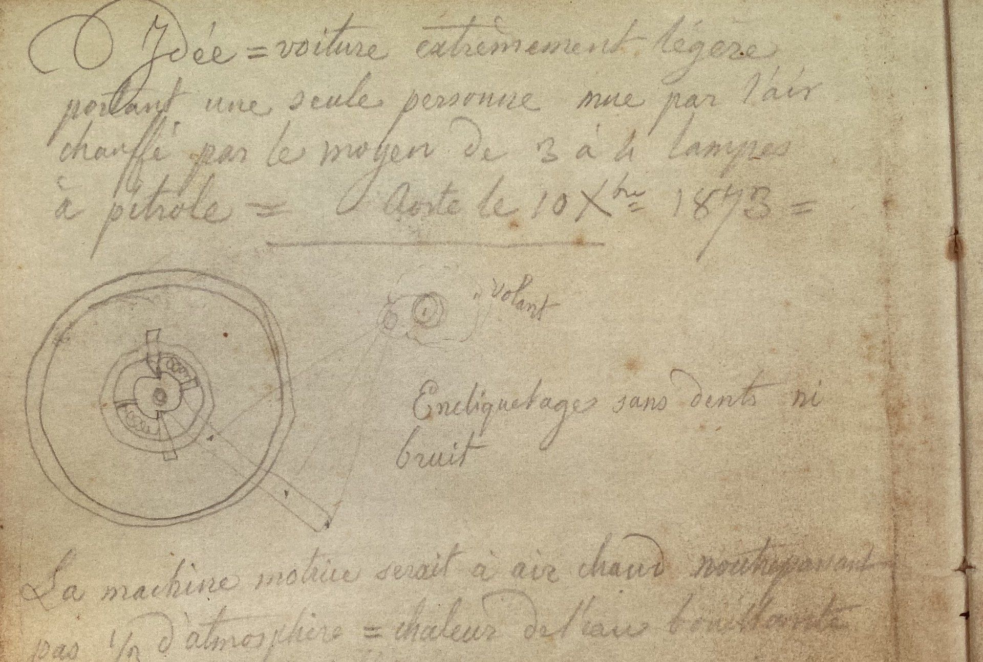 Questa volta, non vi sono giornali o testimonianze indirette da citare per sostenere tale priorità. E’ il suo diario sui motori e sulle autovetture a comprovarlo; e con tanto di data e di disegno: Aoste le 10Xbre 1873. Lo schizzo del volante è chiaro e accanto ad esso è vergata la parola volant