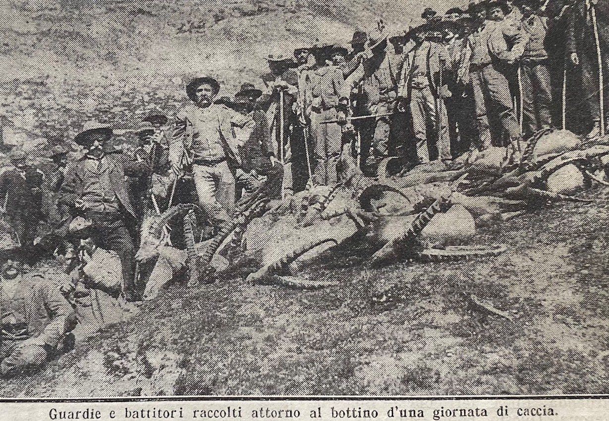 Immagine sotto: Guardie e battitori raccolti attorno al bottino d'una giornata di caccia. in La Domenica del Corriere, 13-20 agosto 1911, p. 7.