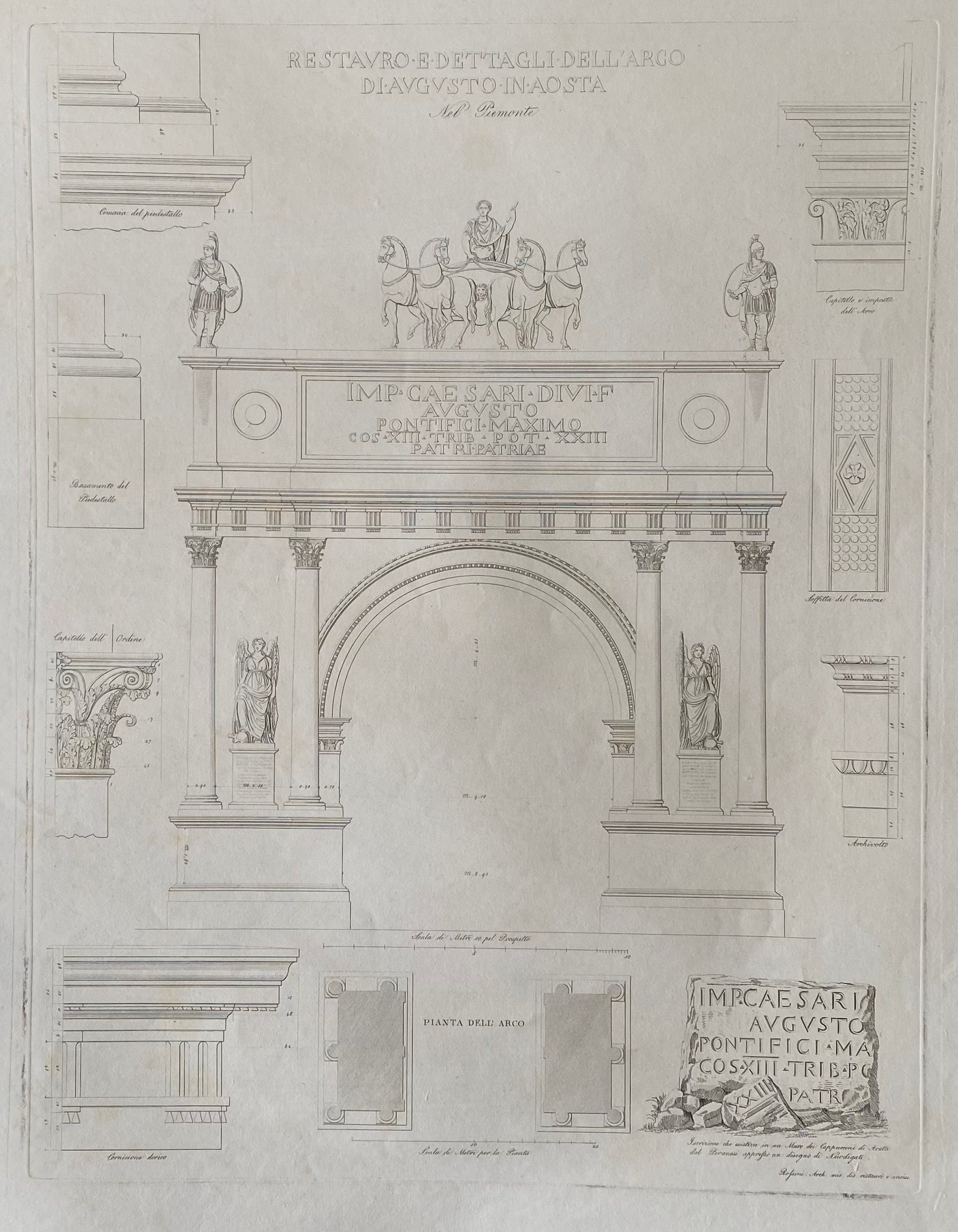 Il progetto, intitolato Restauro e dettagli dell’Arco d’Augusto in Aosta, fu eseguito con la tecnica dell’acquaforte e fa parte della raccolta di 75 incisioni denominata Gli archi trionfali, onorarii e funebri degli antichi romani sparsi per tutta Italia, curata dall’editore Giovanni Scudellari di Roma.